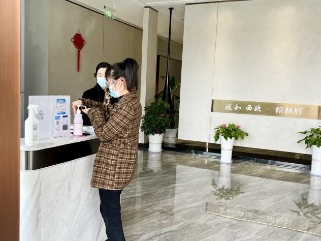 客戶到訪售樓處后,是開展防疫工作的重點階段。翰林府項目嚴格從安全防護的角度出發,嚴苛定制每一項接待流程,讓客戶安心。