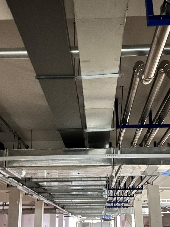 二是最大化保證凈高。最大化保留凈高尺度,提升地下空間的開敞體驗感。主要做法:首先是將主管道貼梁設置,其次是消防噴淋等支管采用梁上預埋套管穿梁設置,在局部梁截面較大位置采用結構梁部分上翻抬高梁下凈高等的方式,對空間占用進行合理布局,確保空間凈高達到2.6米以上。