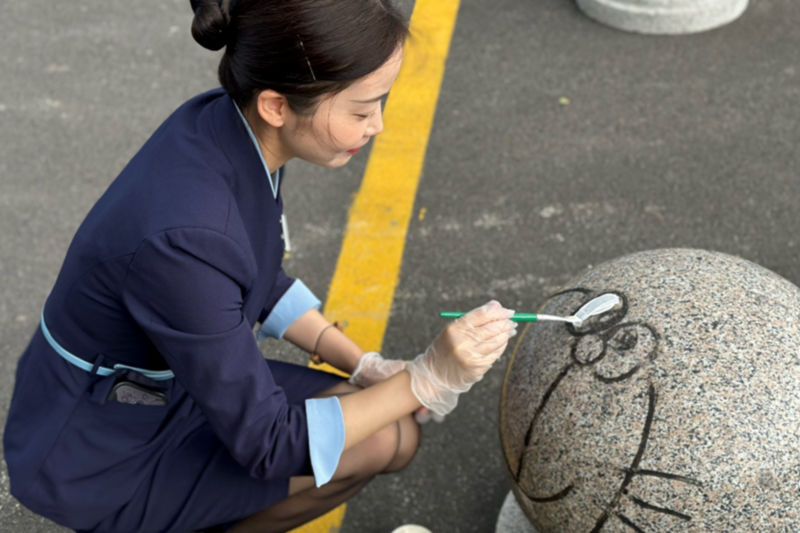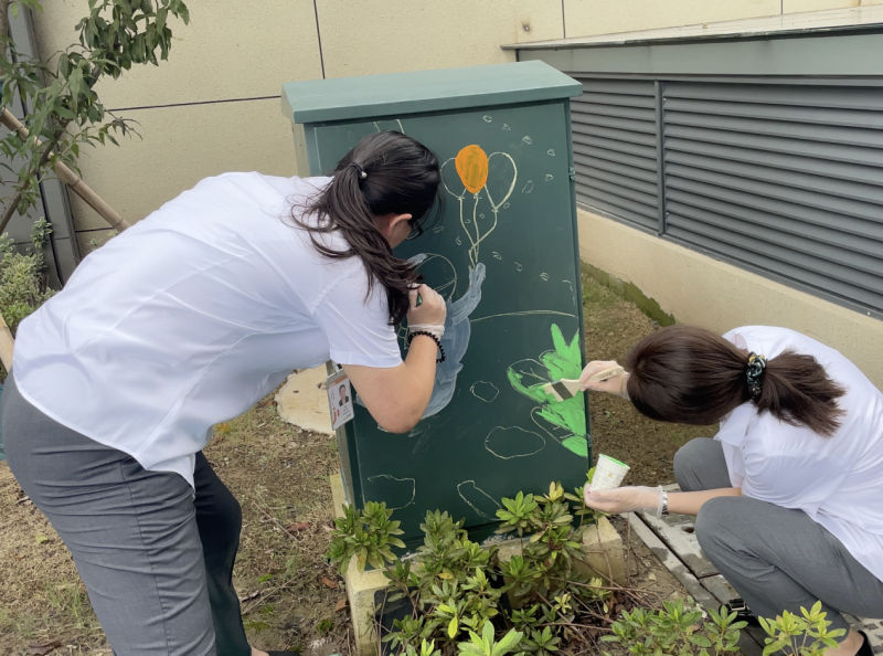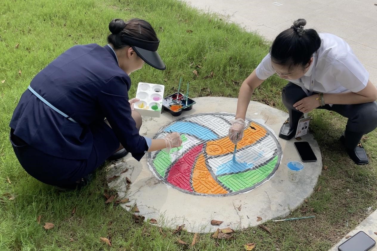 小區(qū)主出入口紅旗飄飄、配上“歡度佳節(jié)”的紅燈籠,濃濃的雙節(jié)氛圍在小區(qū)里渲染開來。悅家人化身“粉刷匠”妙手“粉刷”,他們掃去浮土、除去銹跡、勾勒輪廓、涂料應(yīng)用于輪廓之中,在業(yè)主們歸家的道路上、窨井蓋、沿途石球及配電箱刷上各種美好的色彩,一幅幅生動有趣的畫面躍然而現(xiàn),配合上節(jié)日氛圍布置,給業(yè)主們煥然一新的視覺沖擊。